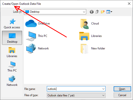- Outlook will display dialog “Create/Open Outlook Data File” in which you should enter a new PST file name and click the Open button.